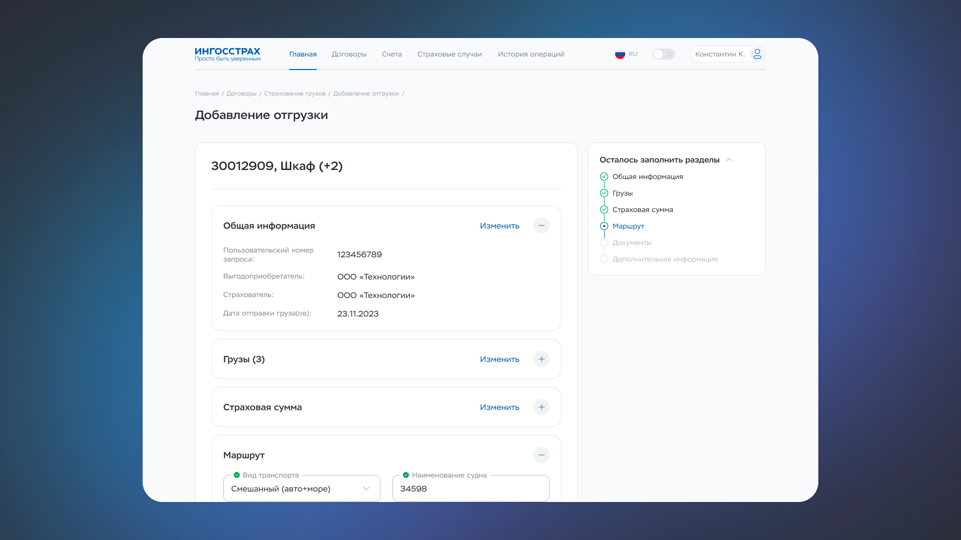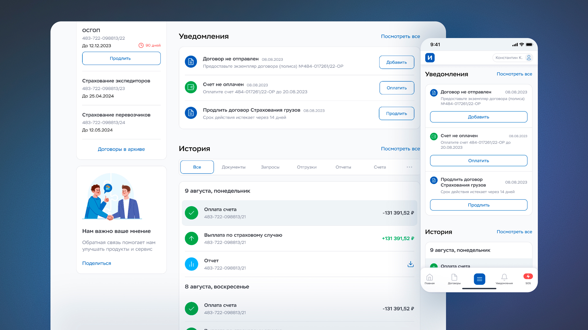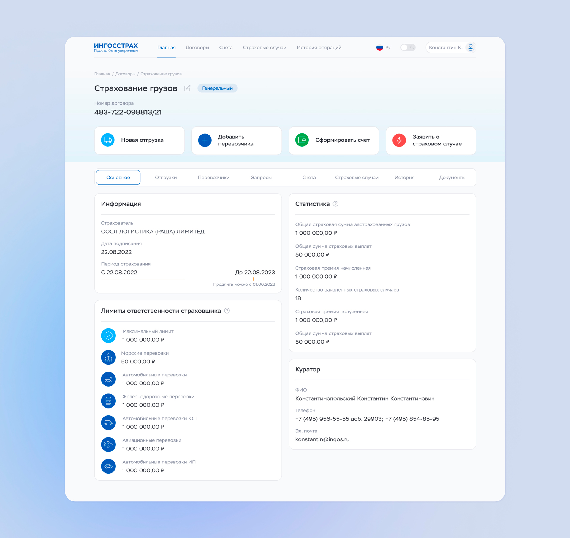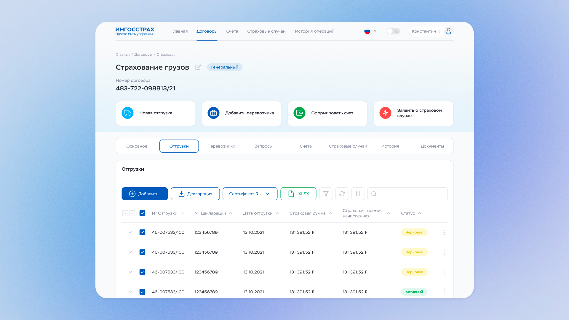 Сервис позволяет управлять договорами, формировать отгрузки, добавлять перевозчиков, выпускать дополнительные соглашения, подавать обращения, смотреть статус заявок, регулировать состав полиса, получать уведомления и взаимодействовать со страховой компанией онлайн без обращения к куратору.