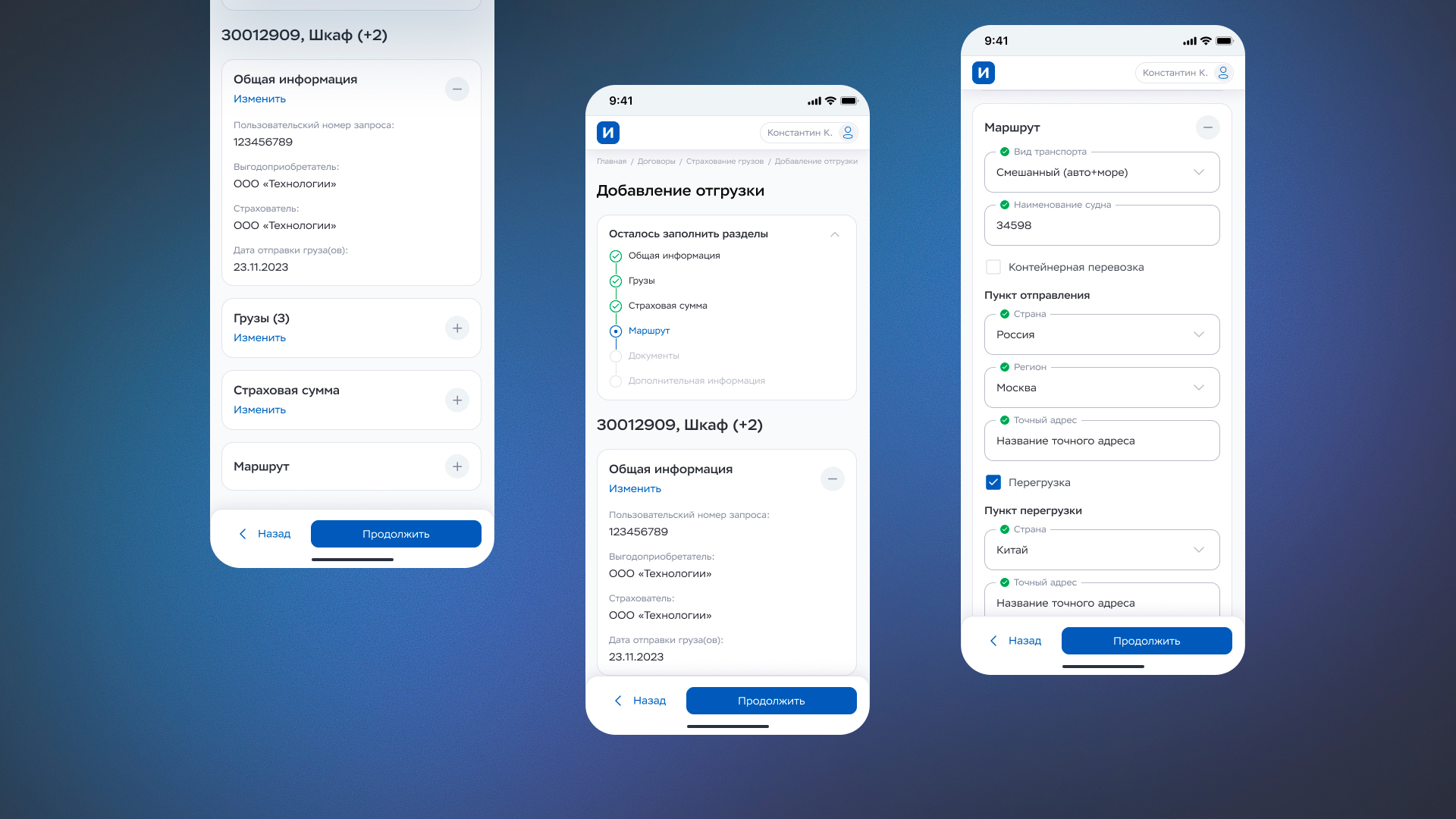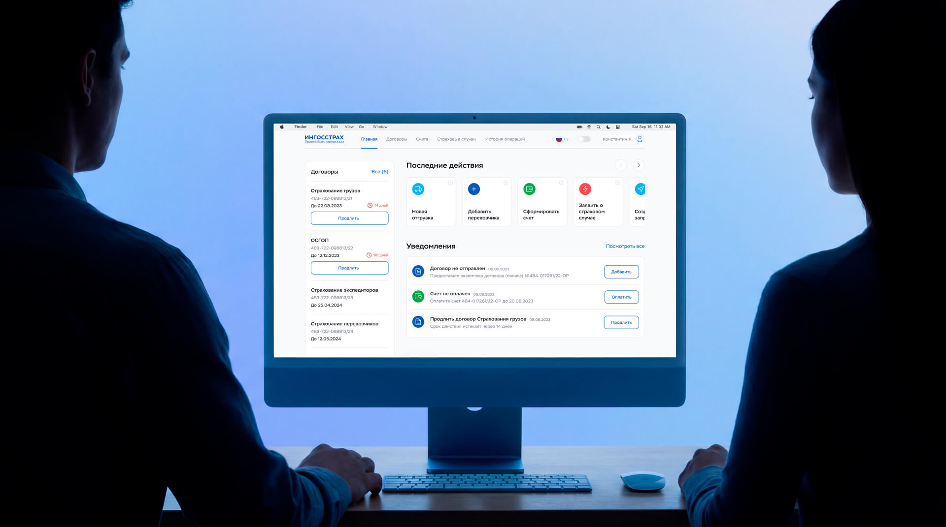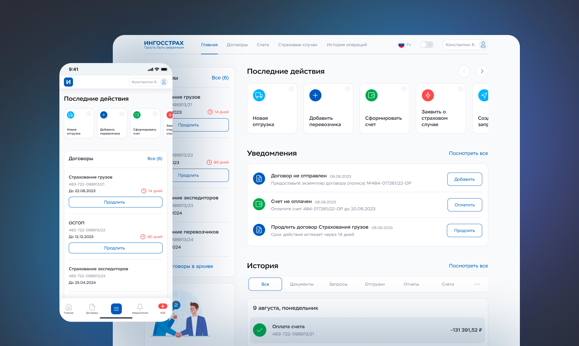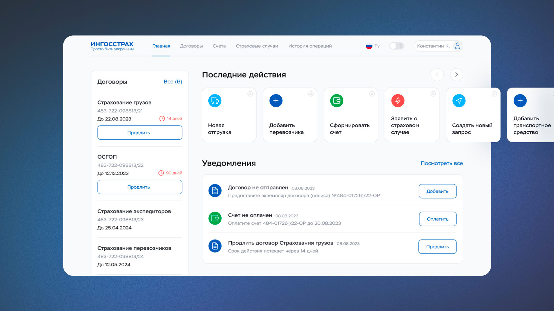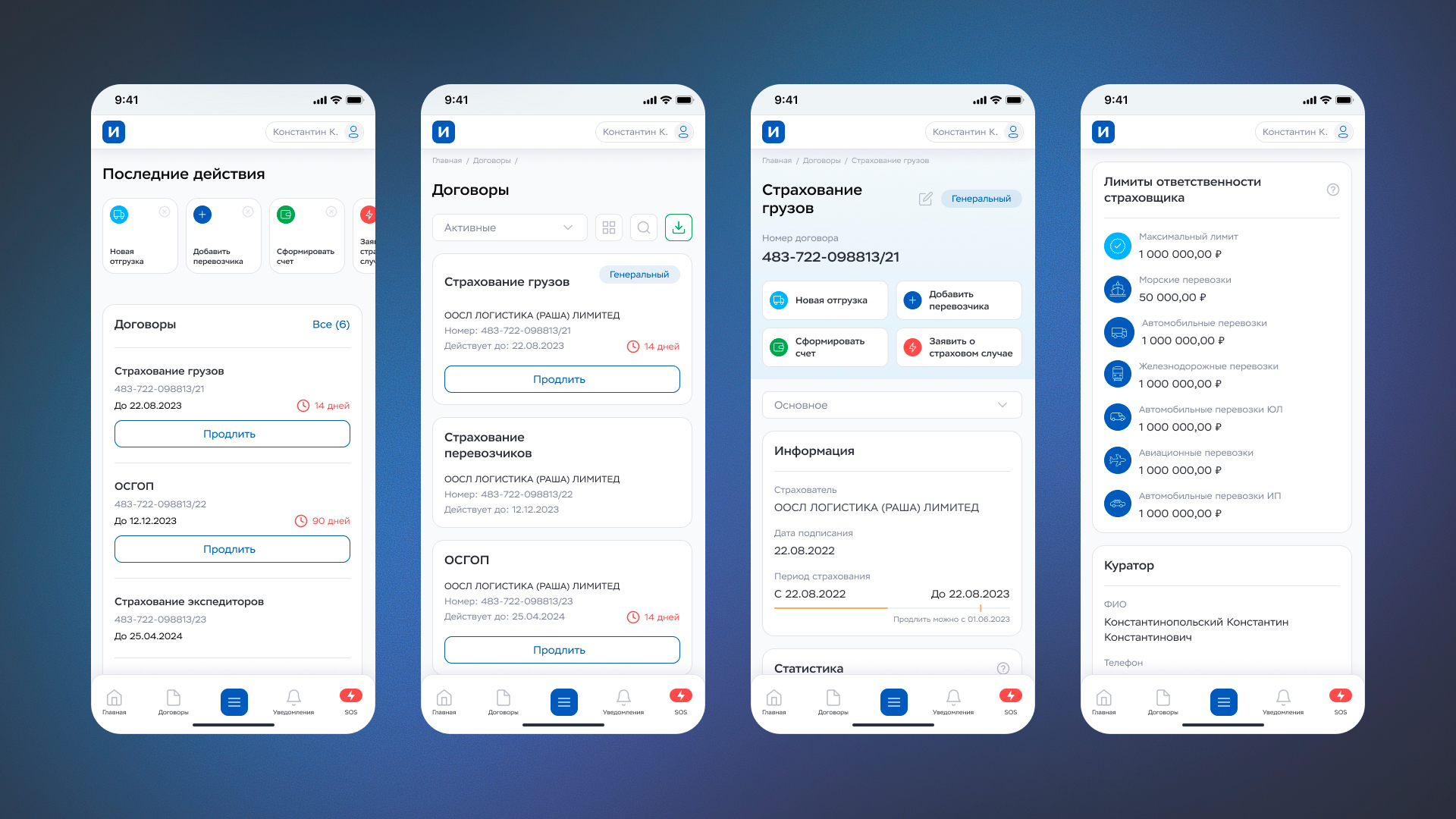Сервис позволяет управлять договорами, формировать отгрузки, добавлять перевозчиков, выпускать дополнительные соглашения, подавать обращения, смотреть статус заявок, регулировать состав полиса, получать уведомления и взаимодействовать со страховой компанией онлайн без обращения к куратору.